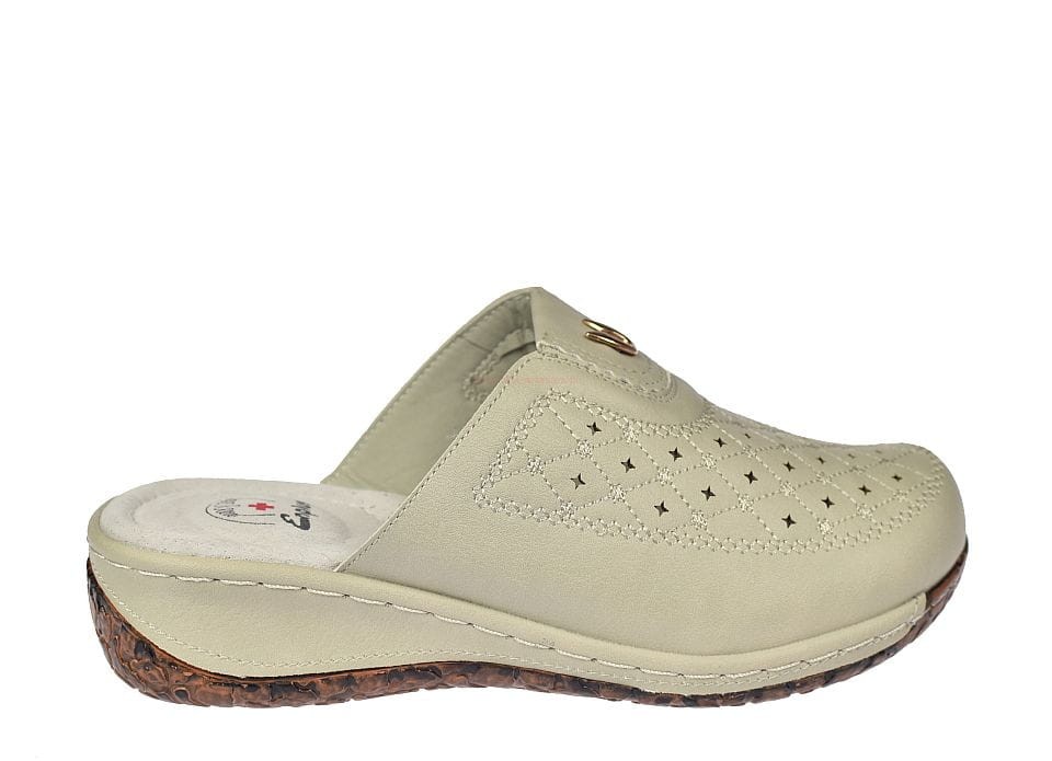 Klapki medyczne damskie Enplus JL395-3 beżowe na koturnie z zakrytymi palcami i wycinaną cholewką. Wyposażone w szeroką gumę na cholewce, która umożliwia dopasowanie nawet do stopy z wysokim podbiciem. Skórzana wkładka zapobiega poceniu się stóp, a antypoślizgowa podeszwa zapewnia bezpieczeństwo. Idealne do pracy w służbie zdrowia, przemyśle spożywczym i farmaceutycznym.