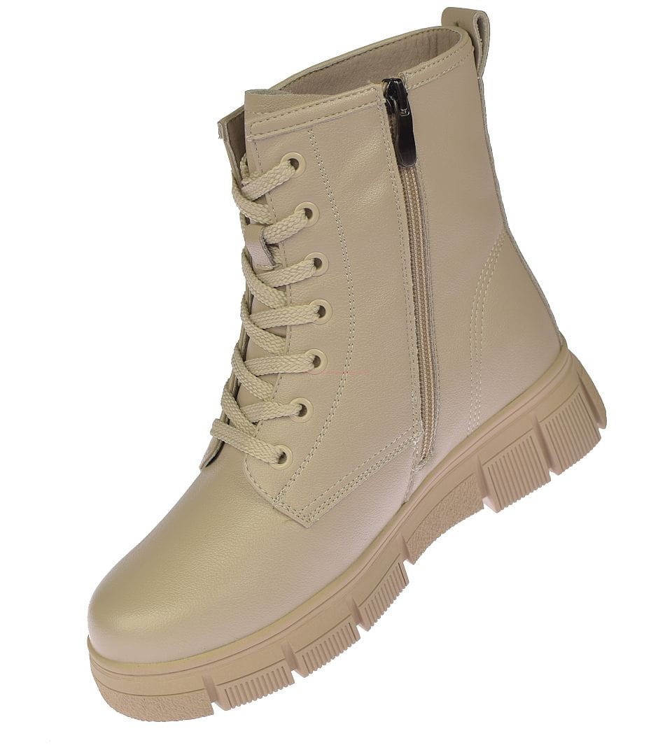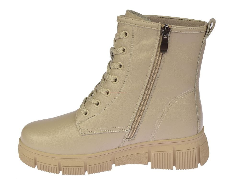 Beżowe botki damskie Skotnicki B-31378 ze skóry naturalnej. Ocieplane, na suwak i sznurowadła, na antypoślizgowej platformie.