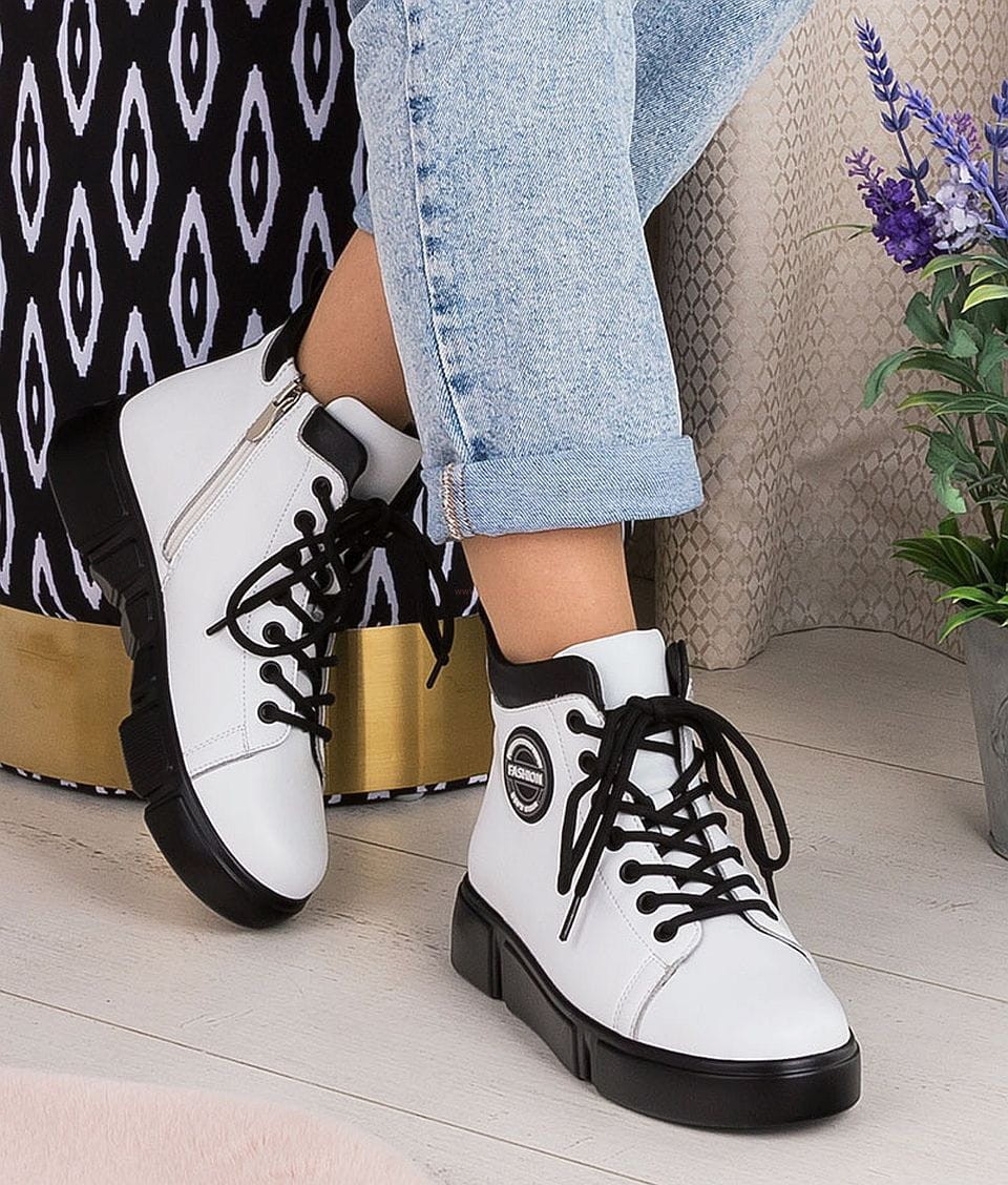 Zapięcie łączy klasyczne sznurowanie oraz praktyczny suwak, co gwarantuje wygodne zakładanie i idealne dopasowanie. Neutralny biały kolor sprawia, że botki łatwo skomponować zarówno ze sportowymi, jak i bardziej eleganckimi stylizacjami.