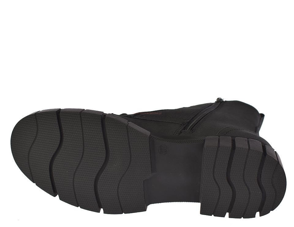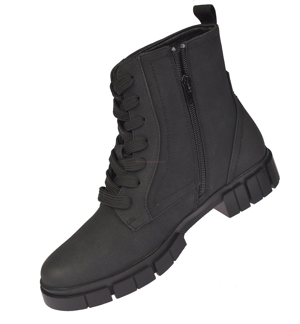 Wysokie botki damskie i glany Skotnicki B-3-1347 w czarnym, matowym kolorze. Wykonane z eko skóry nubukowej, ocieplane, ze sznurowaniem i bocznym suwakiem – wygodne, modne i idealne na chłodne dni.
