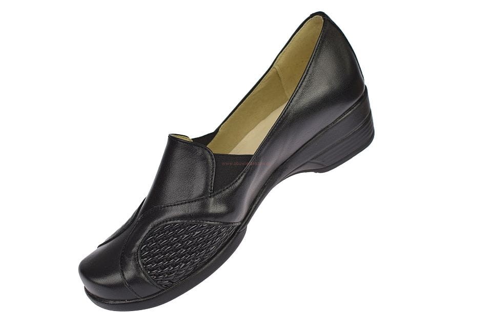 Polskie skórzane buty damskie na haluksy i ostrogi model 952 na koturnie 4 cm. Wykonane z naturalnej skóry licowej z elastyczną strefą w okolicy haluksów. Komfortowe wnętrze ze skórzaną perforowaną wkładką oraz dodatkowymi skórzanymi podpiętkami chroniącymi ostrogi piętowe. Lekka, elastyczna podeszwa TPU zapewnia stabilność i wygodę na co dzień.