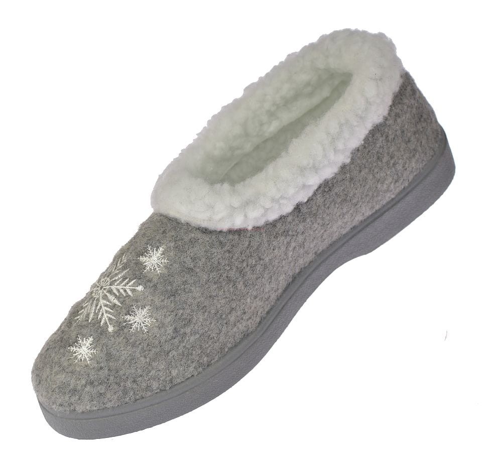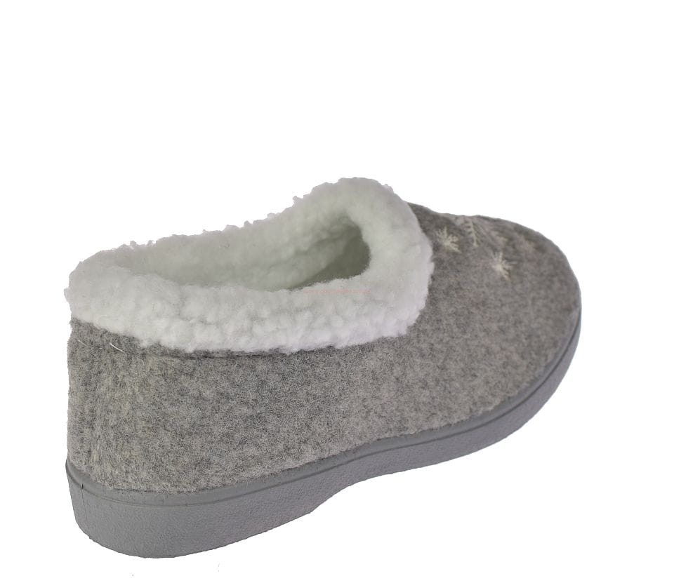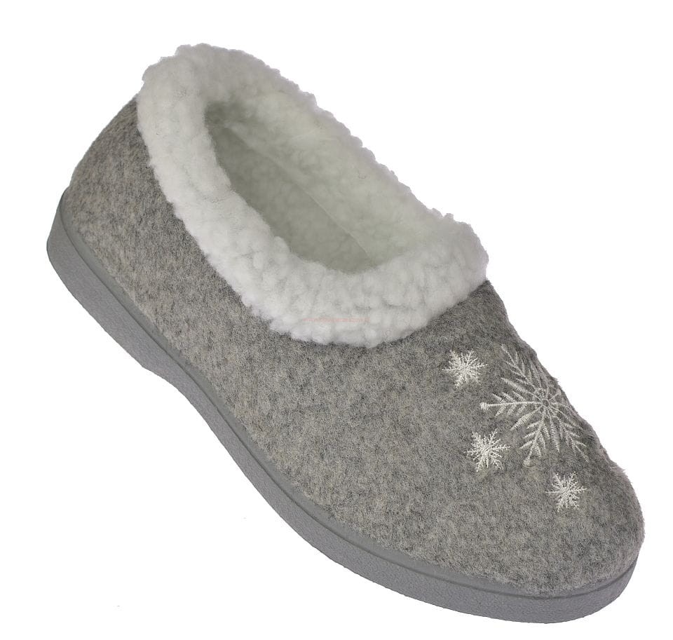 Damskie bambosze filcowe B041 jasny popiel z białym futerkiem i haftem – ciepłe, wygodne i wsuwane kapcie domowe