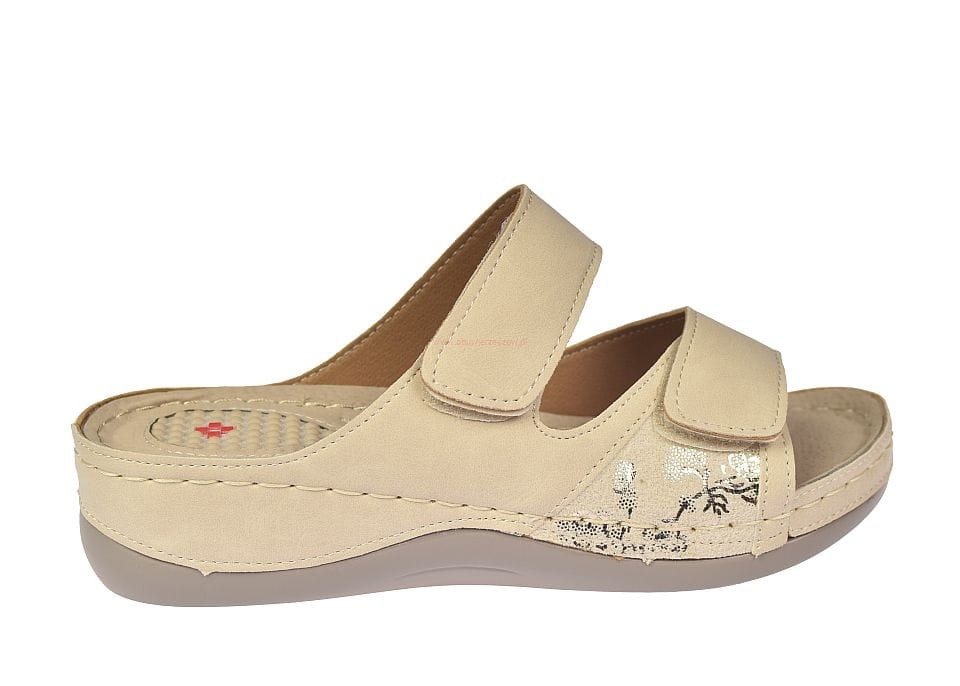 Damskie klapki na ostrogi piętowe Skotnicki KL-3-3017 Lbe – beżowe, na rzepy, profilowana wkładka, komfort i styl na co dzień