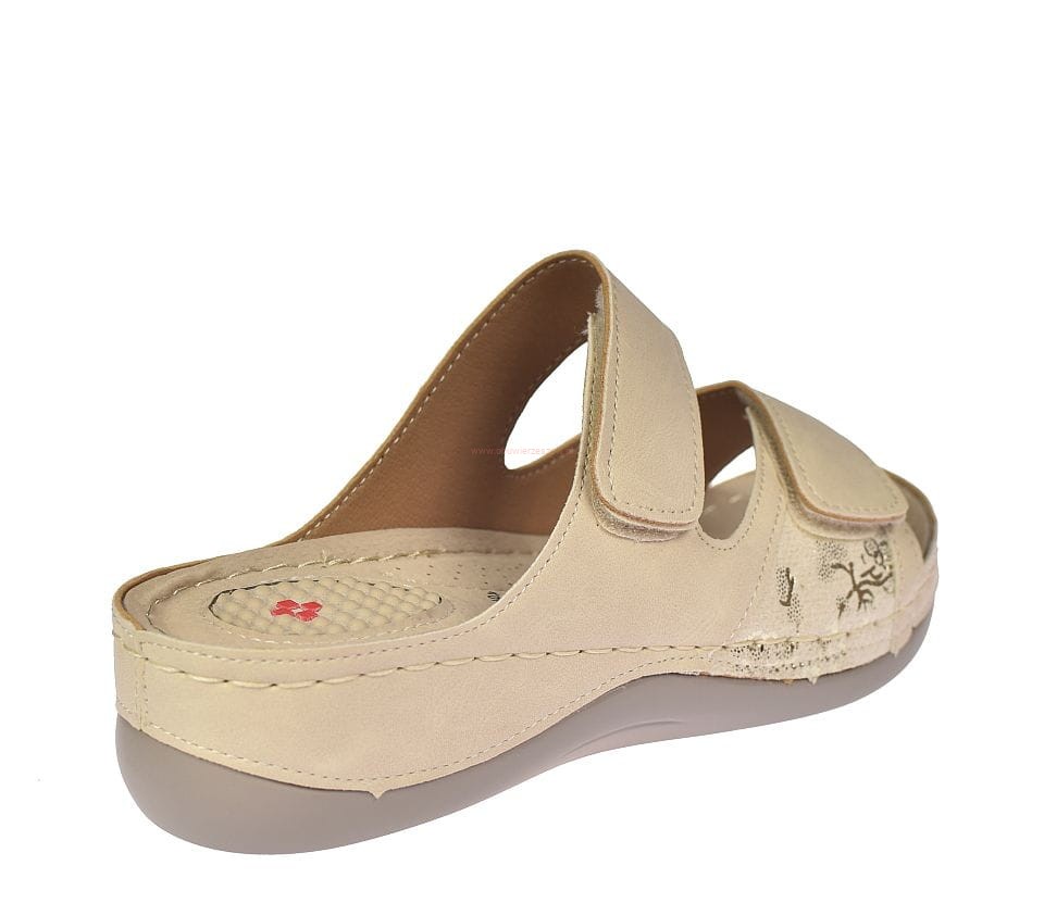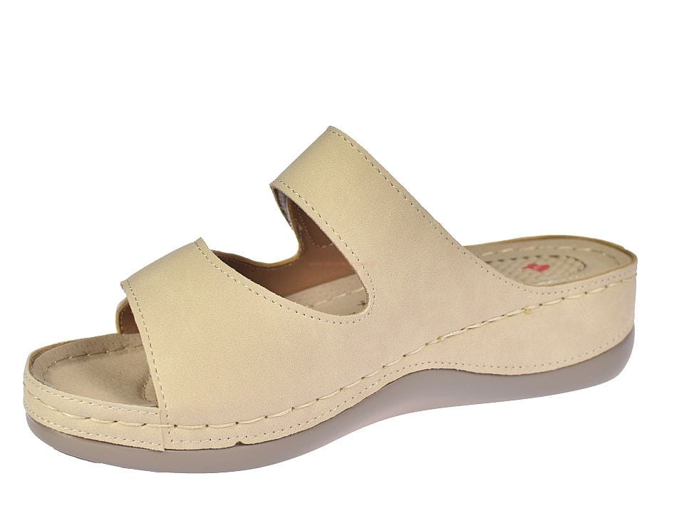 Damskie klapki zdrowotne na koturnie z wkładką na ostrogi piętowe Skotnicki KL-3-3017 – wygodne, stylowe i idealne na lato. Skórzana profilowana wkładka z miękką strefą odciąża pięty, a paski na rzepy pozwalają na idealne dopasowanie. Beżowy kolor pasuje do wielu stylizacji.