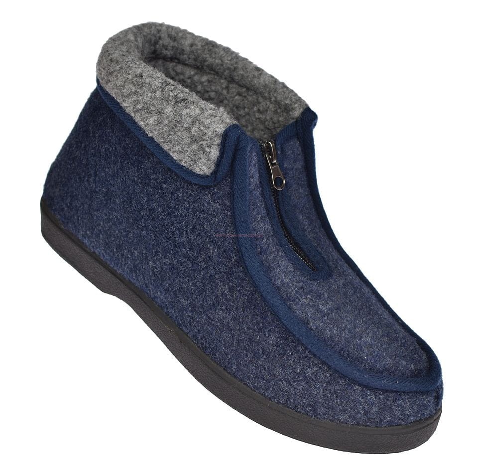 Ciepłe i wygodne kapcie męskie W080-2 granatowe z filcowym wnętrzem i odwijanym futerkiem. Antypoślizgowa podeszwa, idealne do domu i na obejście.