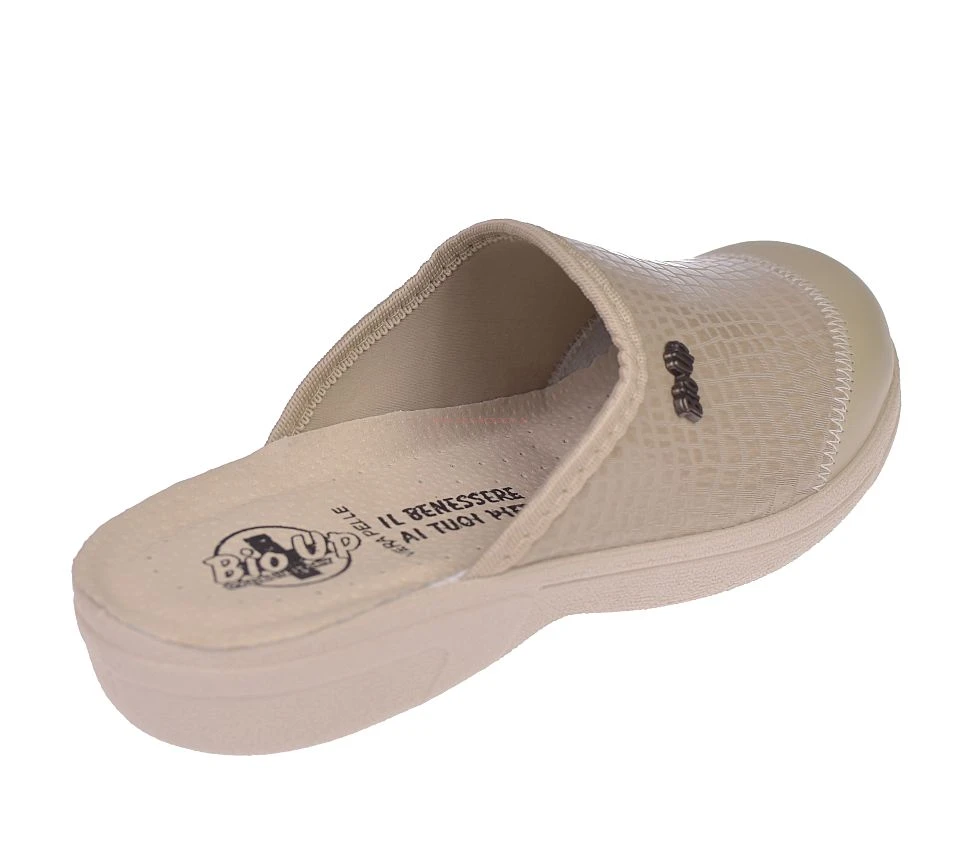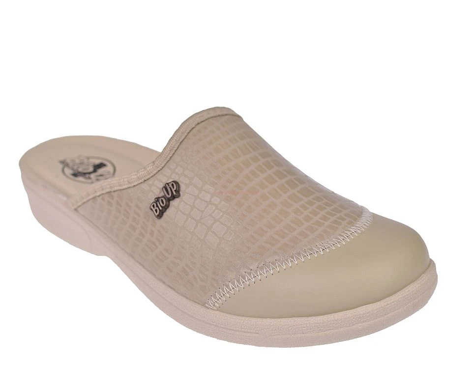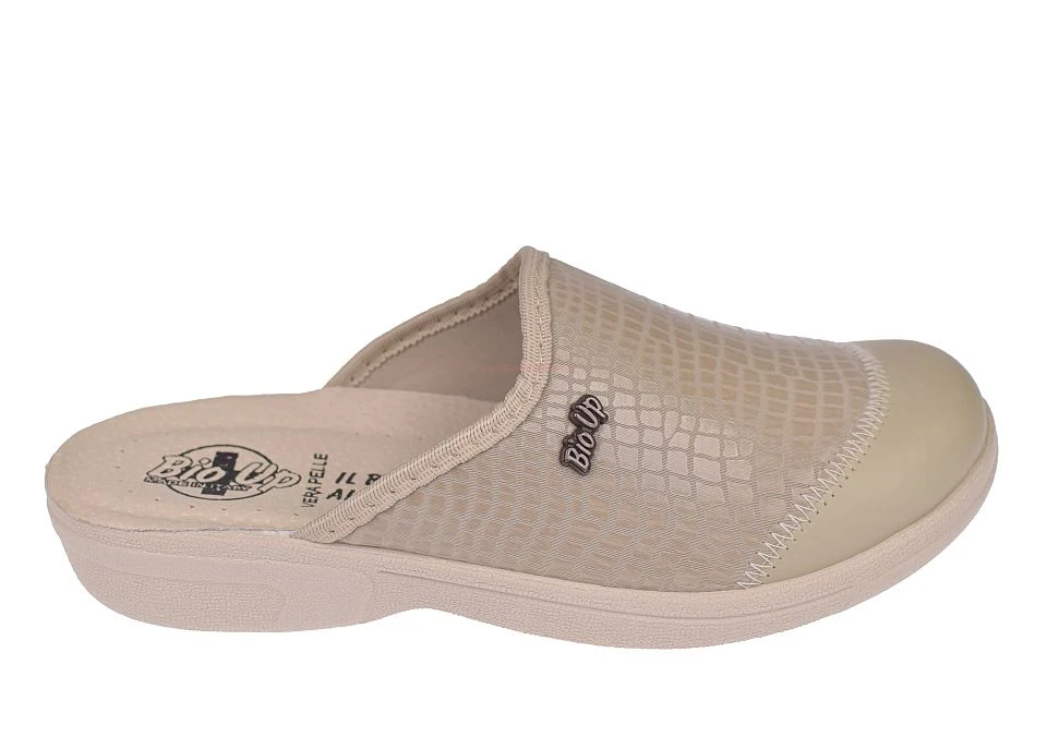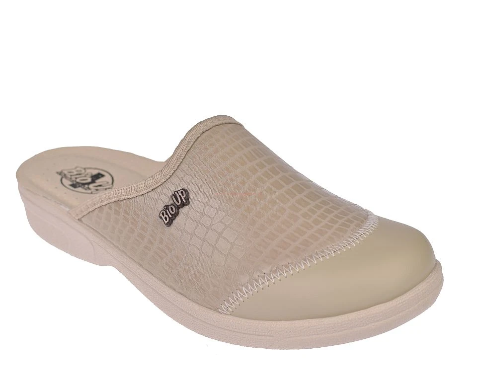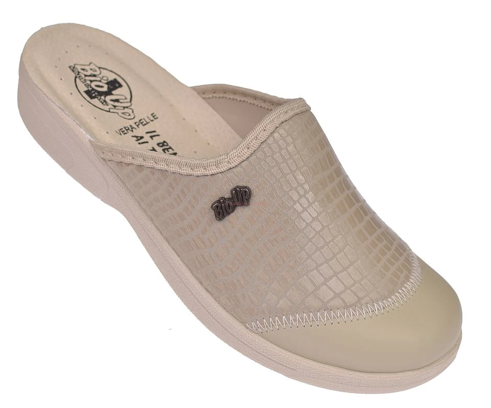 Klapki damskie zdrowotne Bio Up 453 Be/Pelle z elastyczną cholewką z lycry i skórzaną wkładką anatomiczną. Idealne na haluksy, wrażliwe i opuchnięte stopy. Komfort, stabilność i wygoda przez cały dzień – do domu i na zewnątrz.