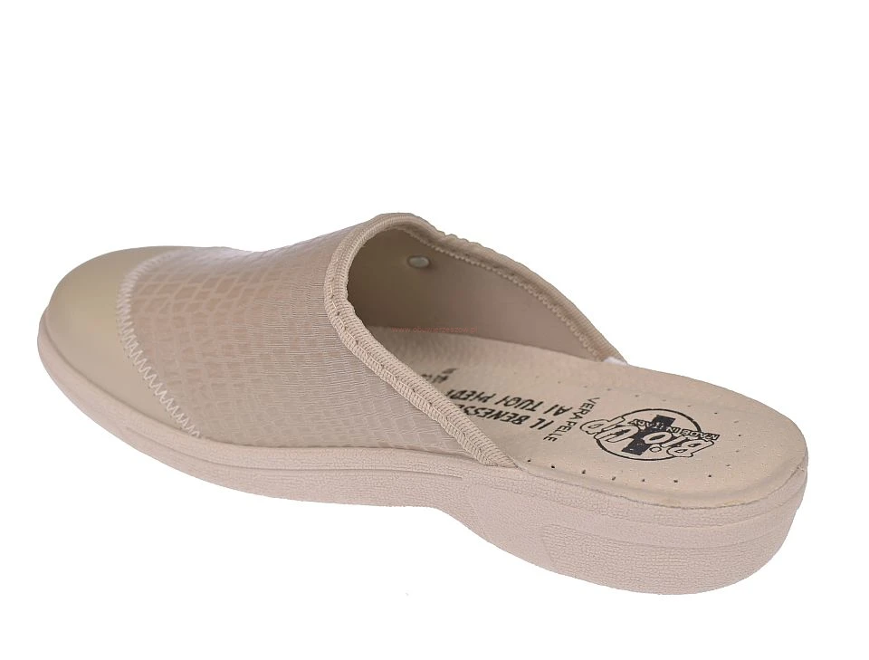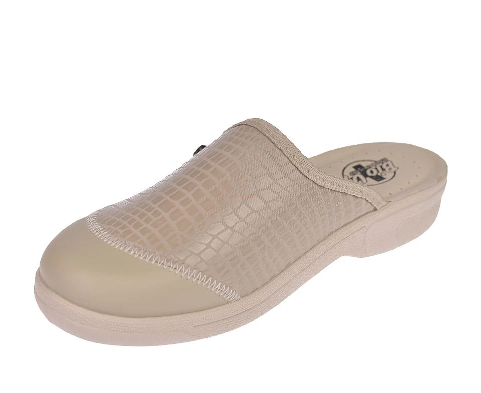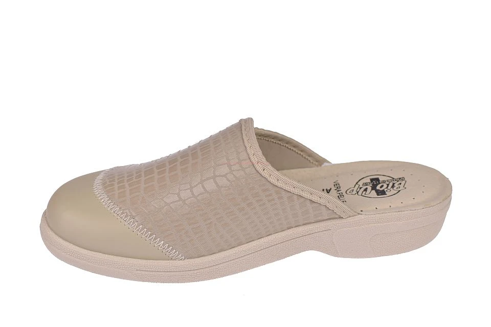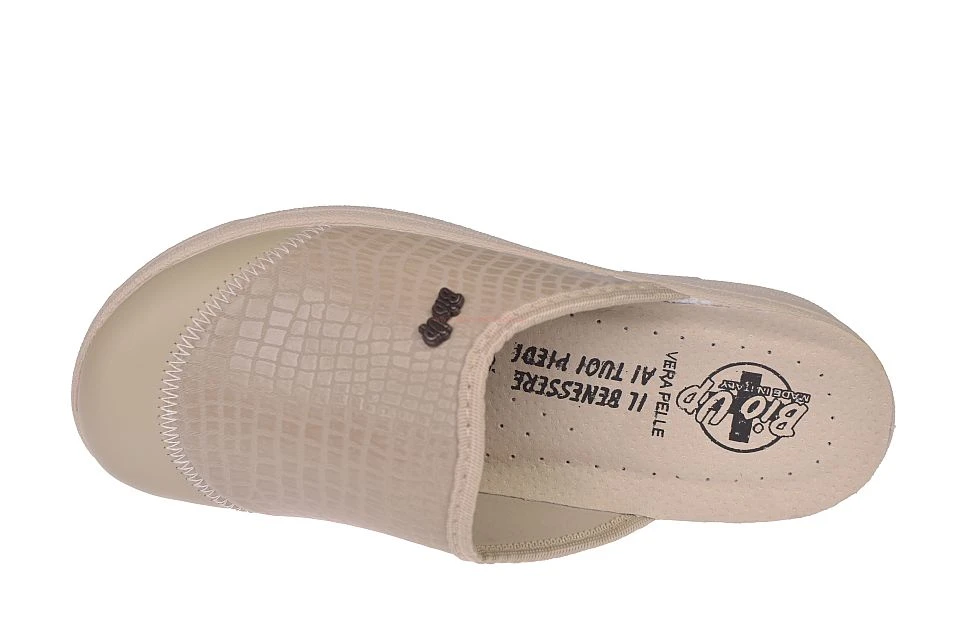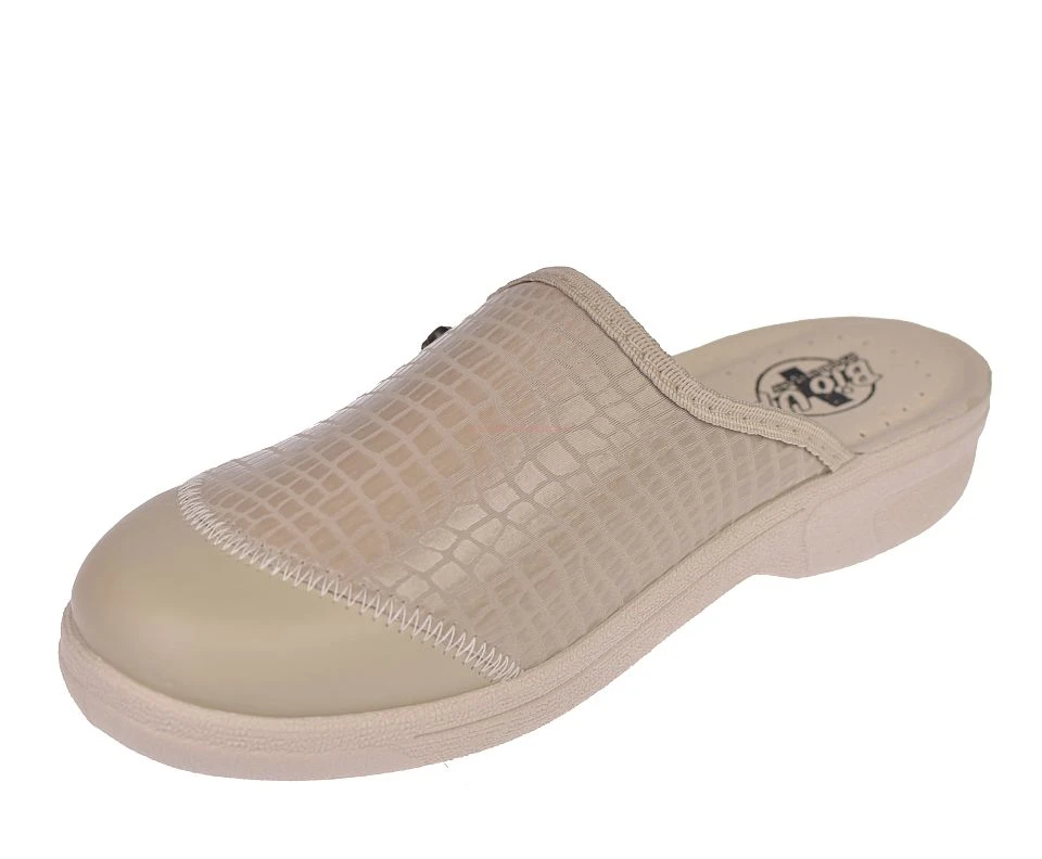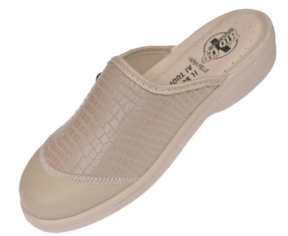 Klapki damskie zdrowotne Bio Up 453 Be/Pelle z elastyczną cholewką z lycry i skórzaną wkładką anatomiczną. Idealne na haluksy, wrażliwe i opuchnięte stopy. Komfort, stabilność i wygoda przez cały dzień – do domu i na zewnątrz.