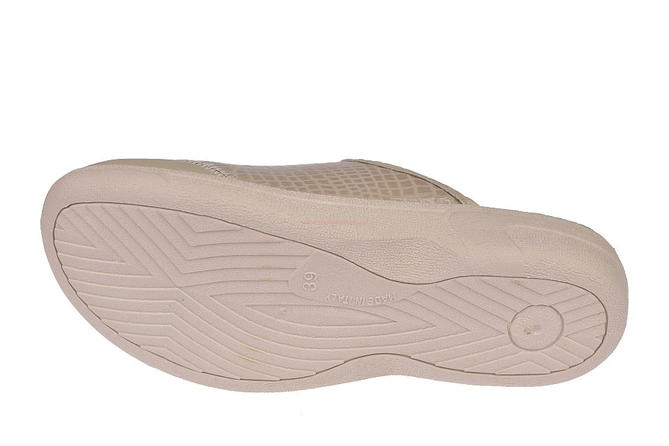 Podeszwa klapek została wykonana z trwałej gumy antypoślizgowej, co zapewnia stabilność na różnych powierzchniach – zarówno w domu, jak i na zewnątrz. Wysokość podeszwy (3,5 cm w pięcie i 2 cm z przodu) zapewnia odpowiednie podparcie i komfort chodzenia.