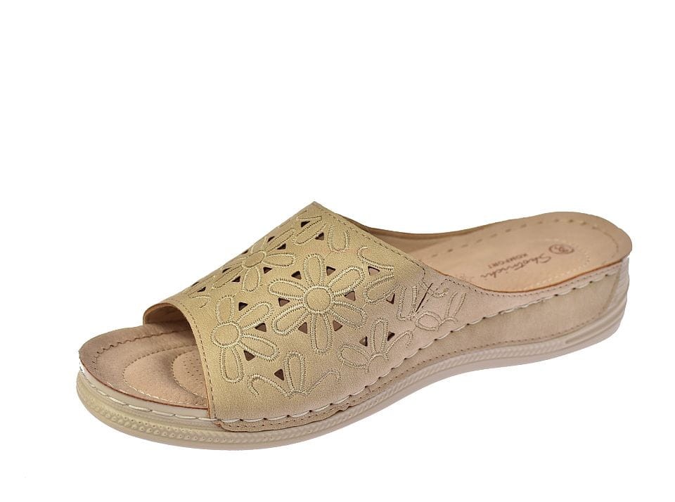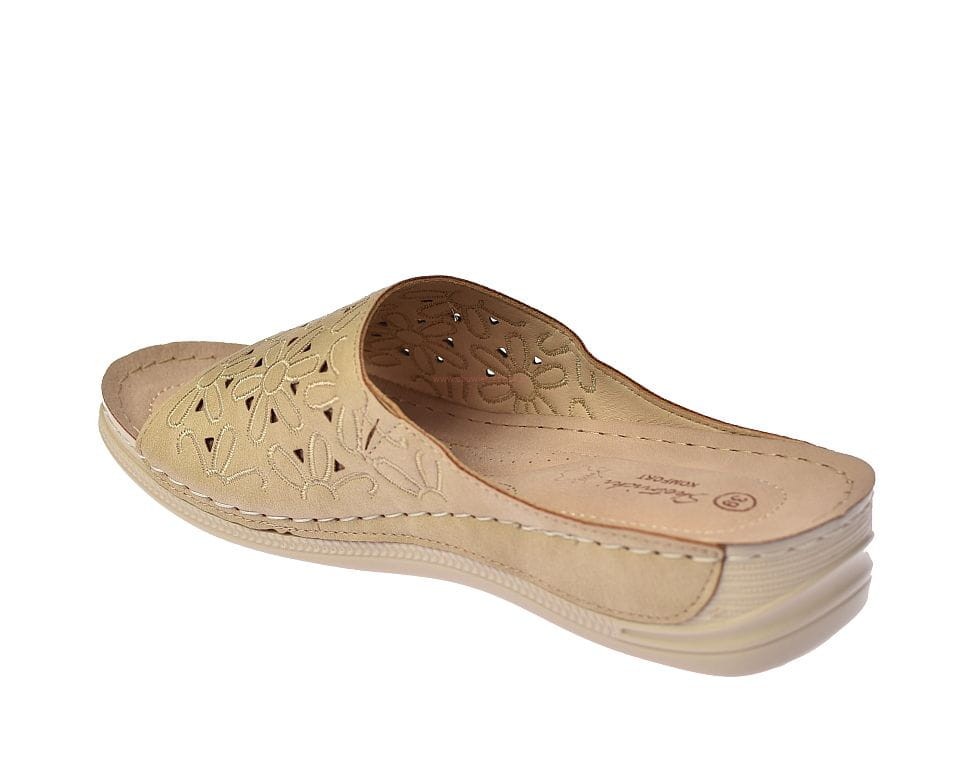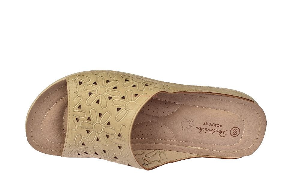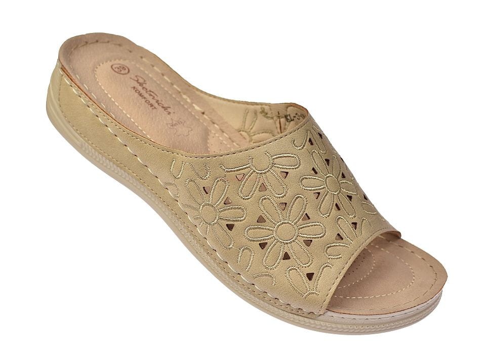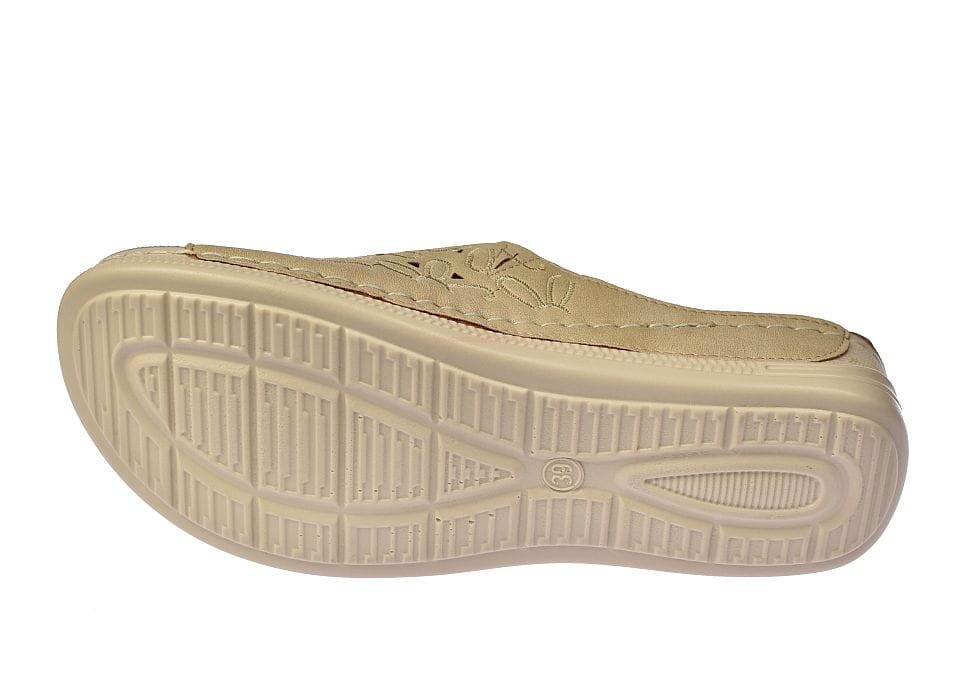 Klapki damskie w kolorze beżowym, wykonane z wysokiej jakości naturalnej skóry, z delikatnym ażurowym wzorem. Idealne na lato, łączą komfort z subtelną elegancją, doskonałe do codziennych stylizacji.