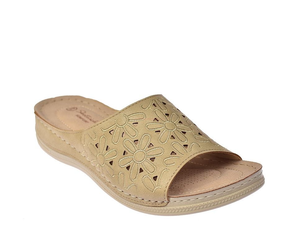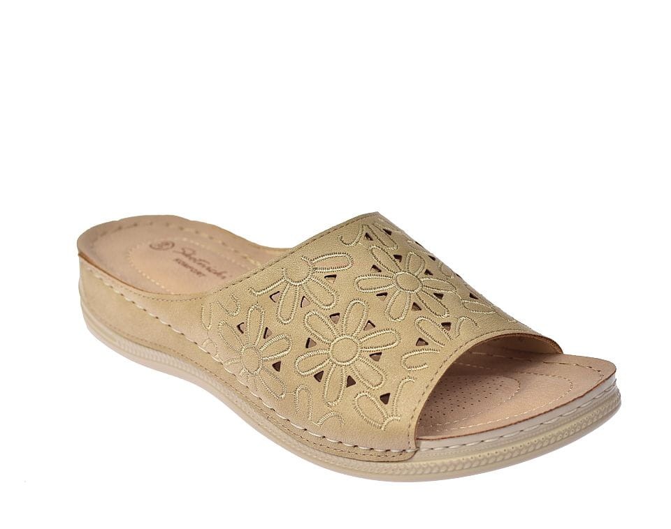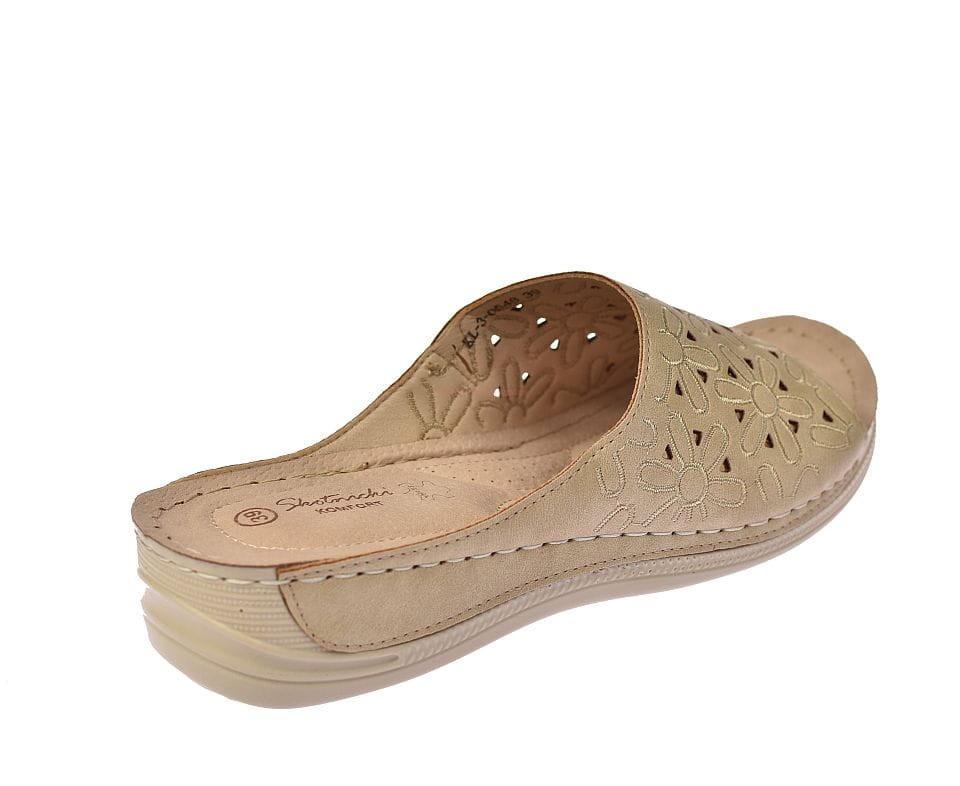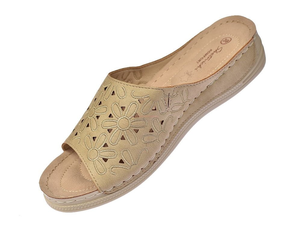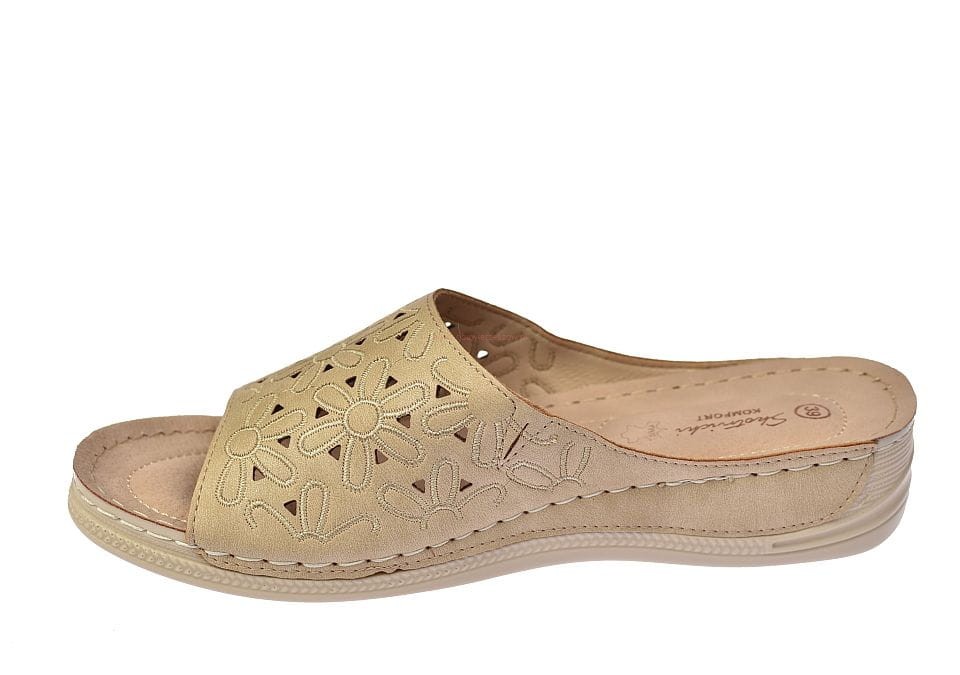 Klapki damskie w kolorze beżowym, wykonane z wysokiej jakości naturalnej skóry, z delikatnym ażurowym wzorem. Idealne na lato, łączą komfort z subtelną elegancją, doskonałe do codziennych stylizacji.