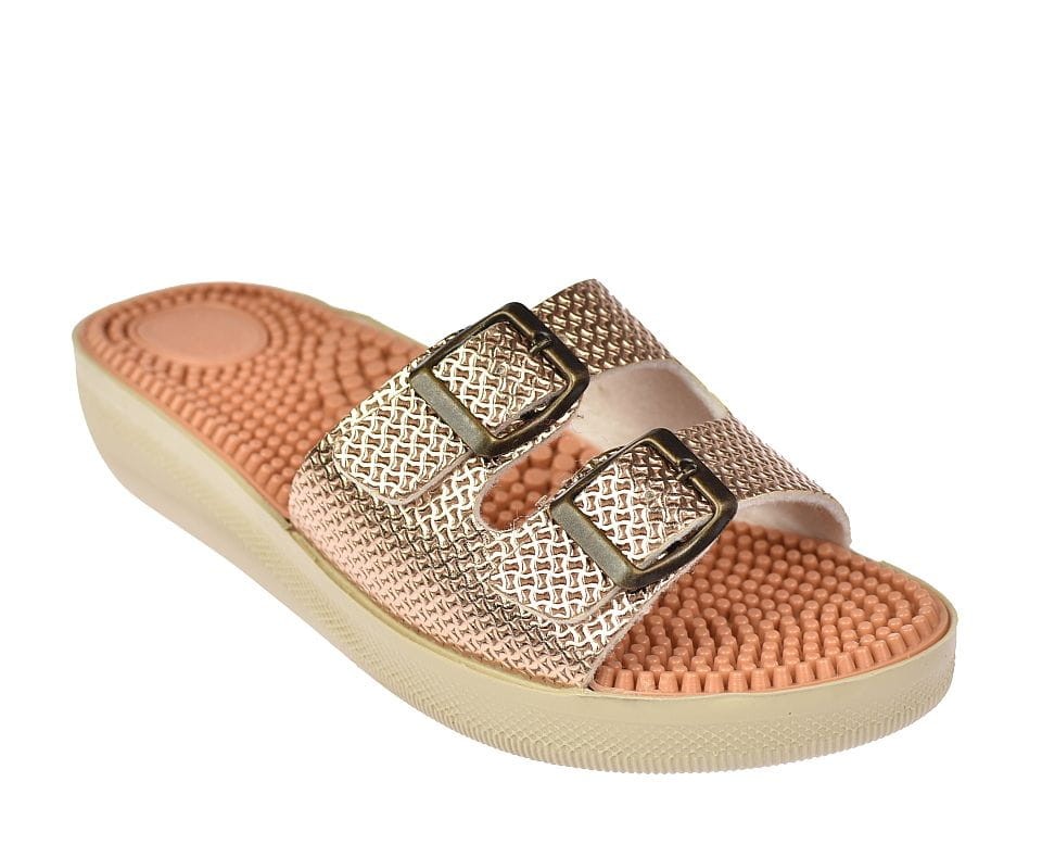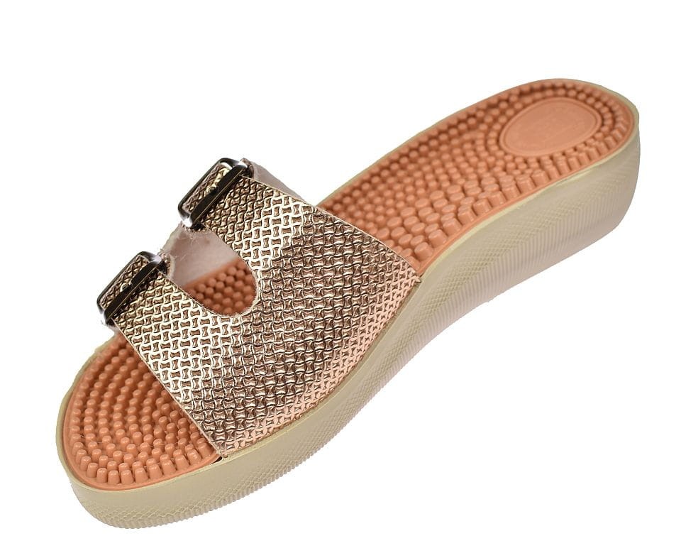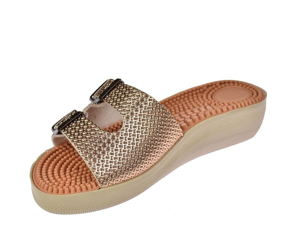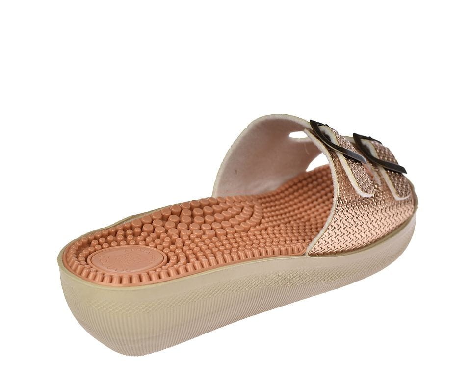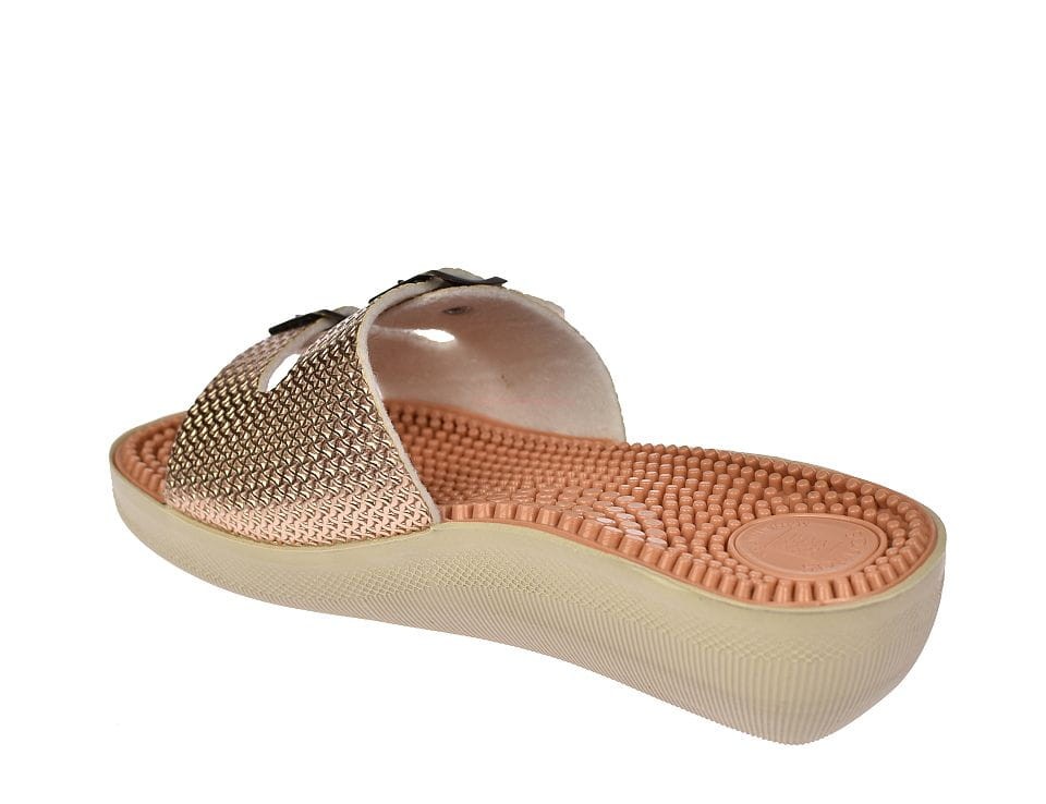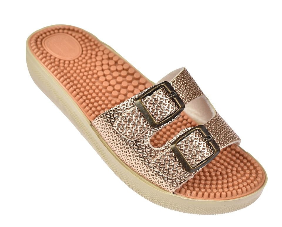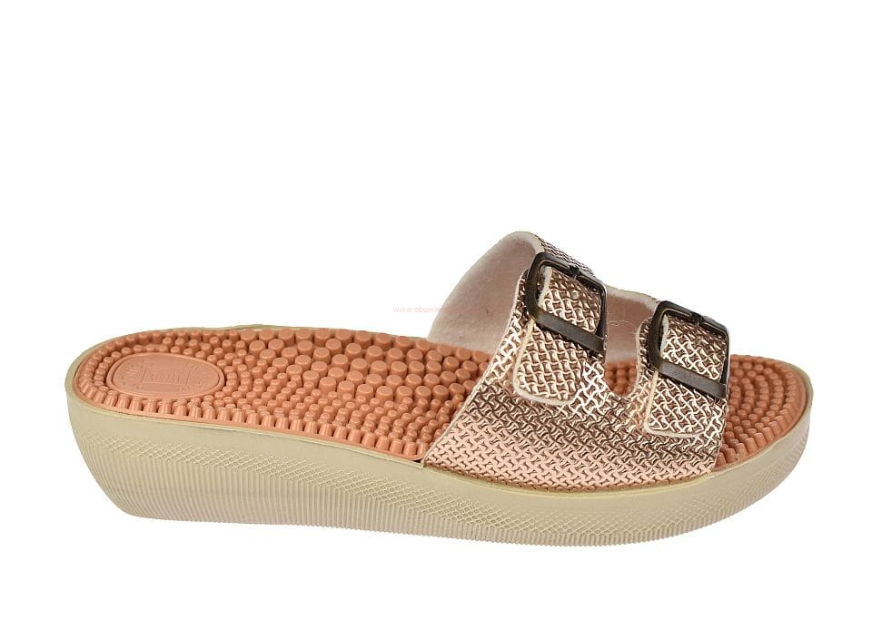 Klapki fakirki damskie Sanitas 2P31 w kolorze beżowym ze złotym paskiem. Wygodna wkładka z kolcami masującymi stopy, poprawia krążenie i łagodzi ból pleców. Włoska jakość i elegancki design.