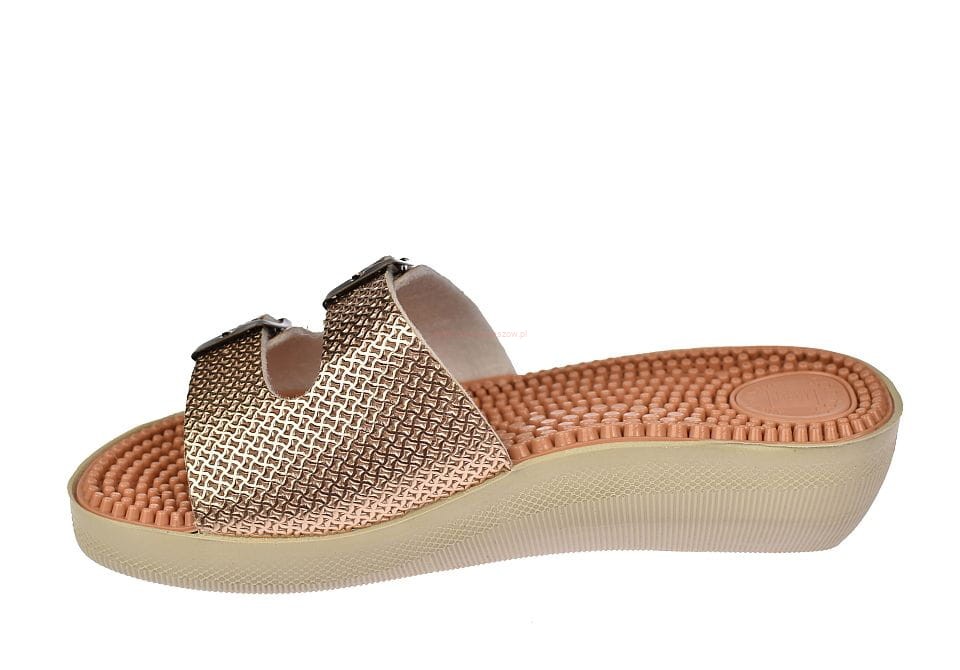 Miękka, amortyzująca podeszwa z trwałego tworzywa sztucznego skutecznie tłumi nierówności podłoża. Cholewka na dwa regulowane paski zapinane na metalowe klamerki umożliwia idealne dopasowanie do stopy. Klapki nie tylko wspierają zdrowie stóp, ale również prezentują się wyjątkowo stylowo – metaliczne wykończenie przyciąga wzrok i sprawdzi się zarówno w domu, jak i na zewnątrz.