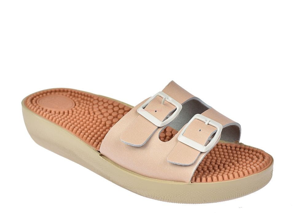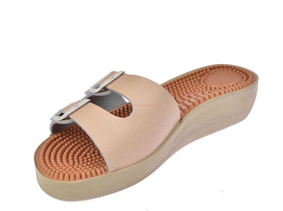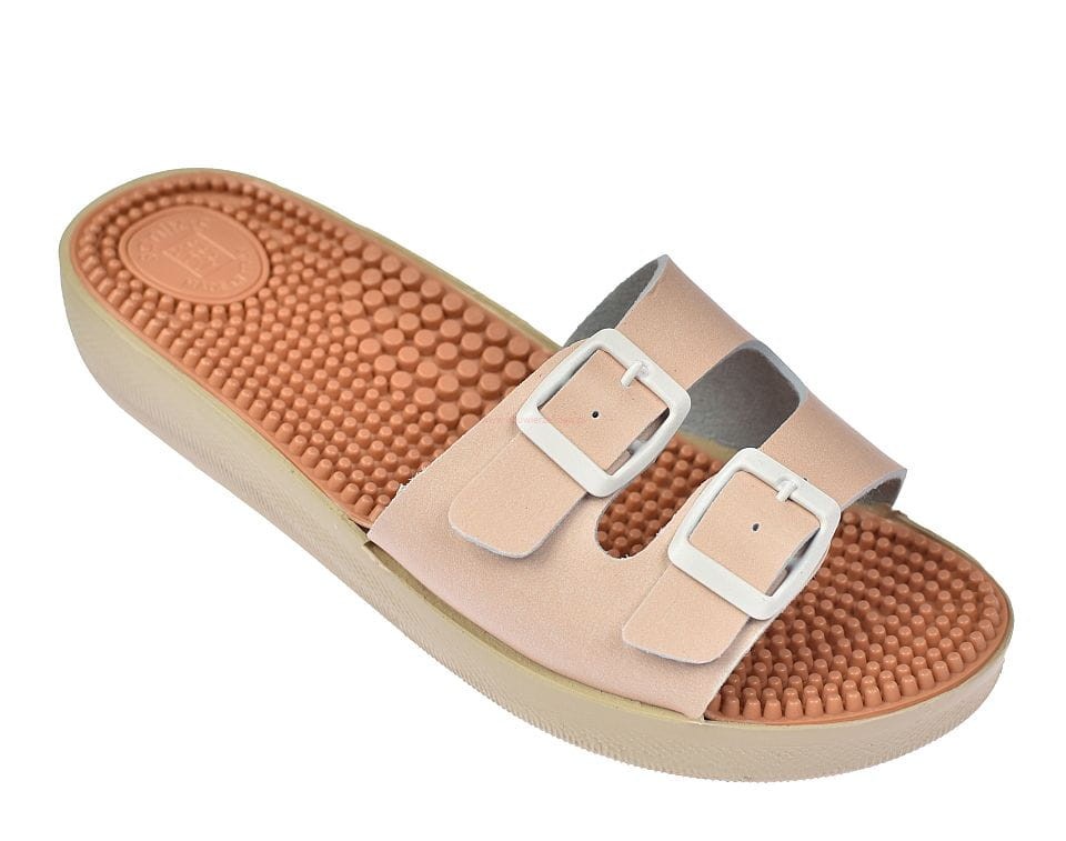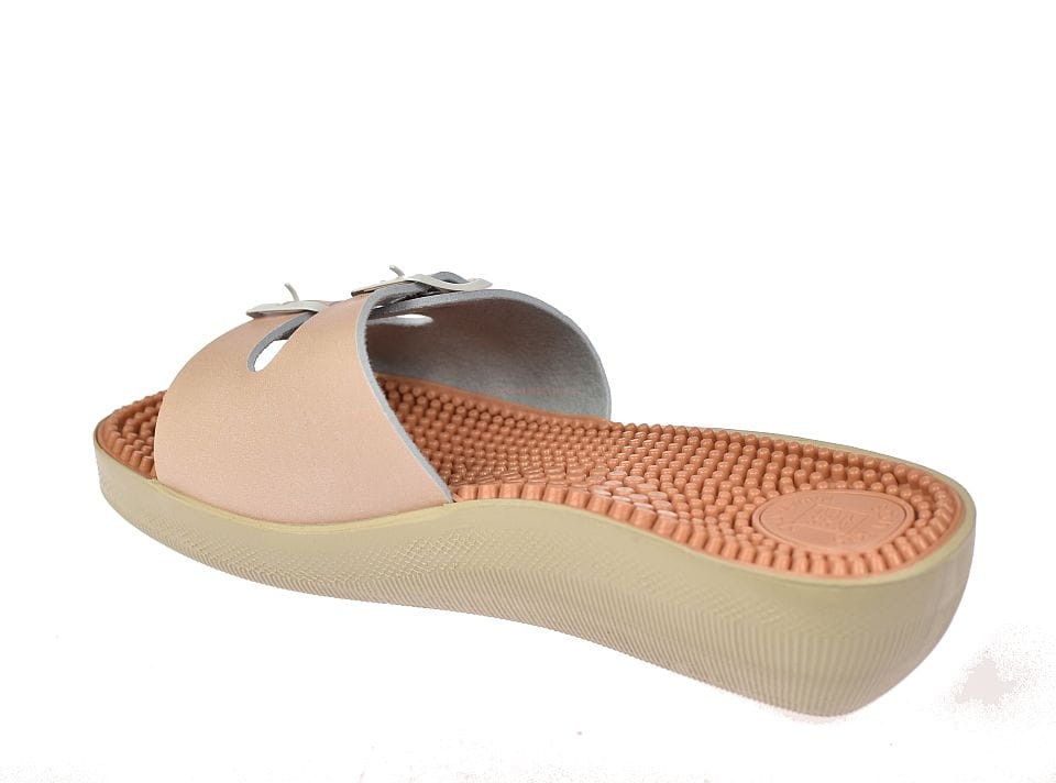 Wyprofilowana wkładka z tworzywa sztucznego wyposażona została w twarde kolce masujące, które stymulują receptory na stopach, naśladując działanie akupresury. Dzięki temu klapki mogą przynosić ulgę w przypadku dolegliwości takich jak bóle pleców, rogowacenie, obrzęki, słabe krążenie, czy uczucie ciężkości nóg. Miękka podeszwa dobrze absorbuje nierówności, zapewniając wygodę podczas chodzenia.