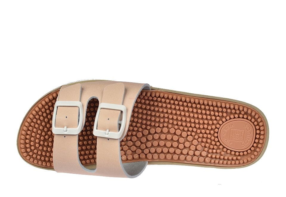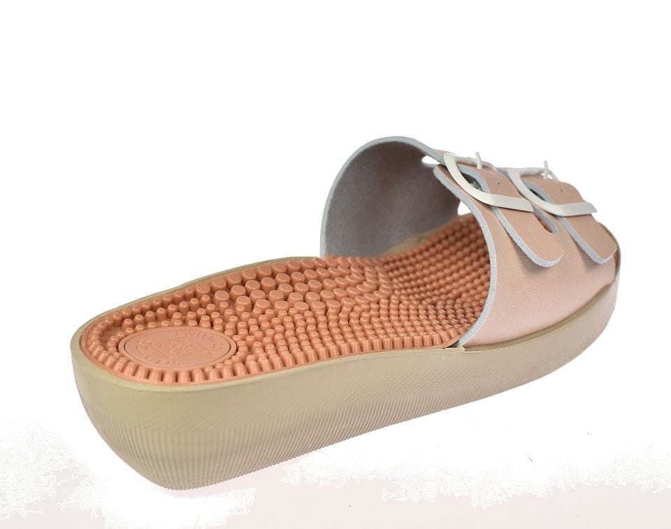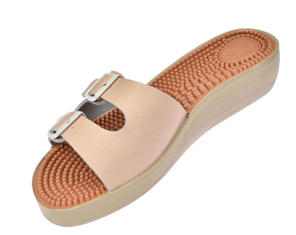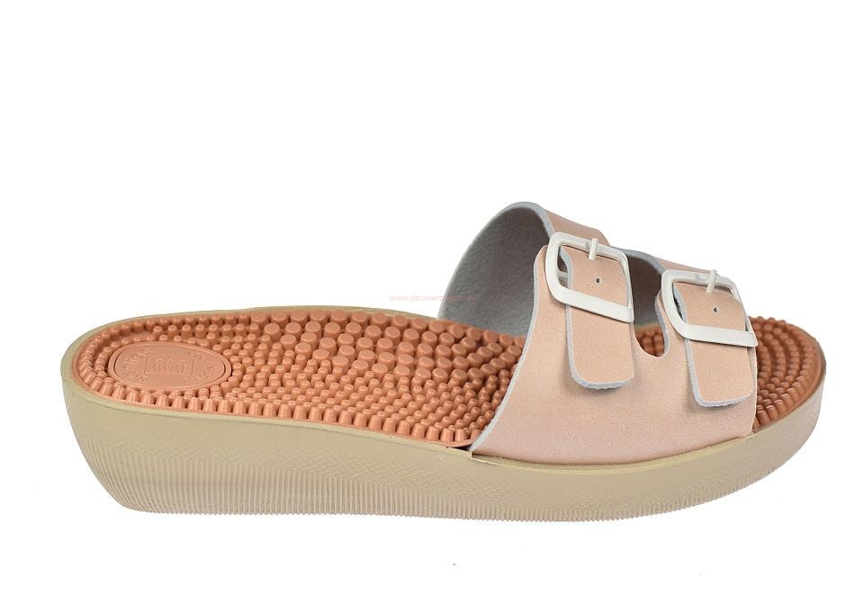 Damskie klapki fakirki Sanitas 2P27 w kolorze jasny beż z masującymi kolcami, regulowane na dwa paski. Wygodne, zdrowotne obuwie idealne na co dzień – łagodzą bóle pleców, poprawiają krążenie i wspierają regenerację stóp.