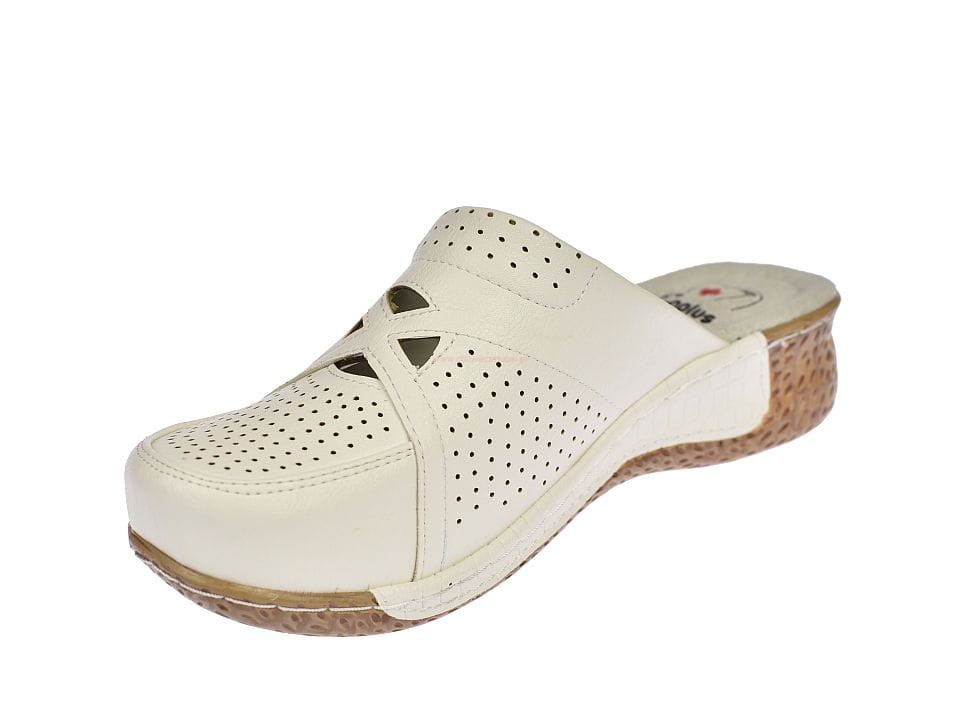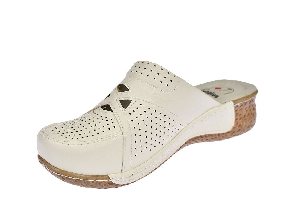 Białe klapki medyczne damskie na koturnie z zakrytymi palcami i wycinaną cholewką, ze skórzaną wkładką zapobiegającą poceniu się stóp z serii medical comfort.