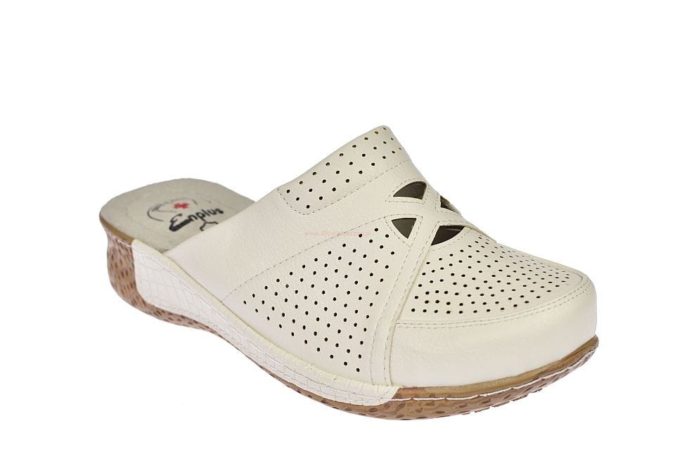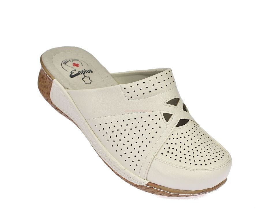 Białe klapki medyczne damskie z zakrytymi palcami i wycinaną cholewką stosowane często jako obuwie medyczne, profilaktyczne , oraz w przemyśle spożywczym firmy Enpuls.