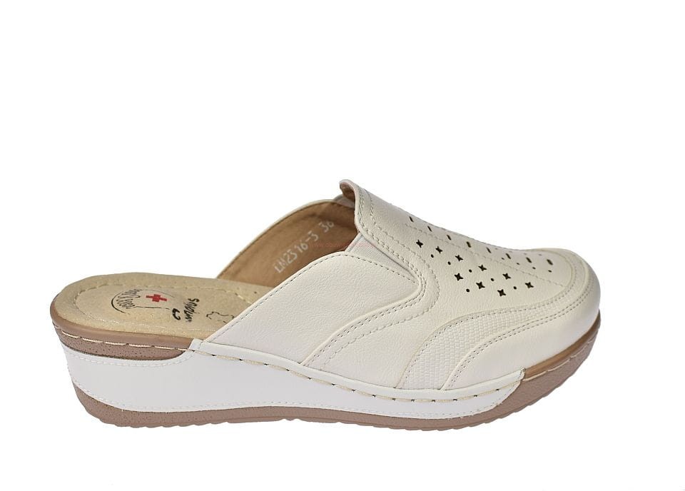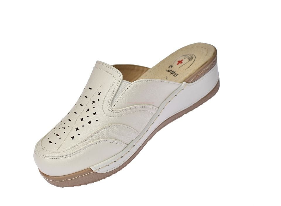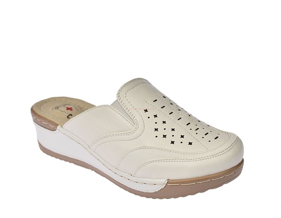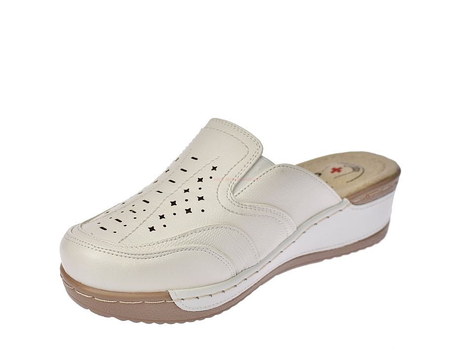 Klapki medyczne białe damskie na koturnie z gumkami i zakrytymi palcami i skórzaną wkładką zapobiegającą poceniu się stóp serii medical comfort.