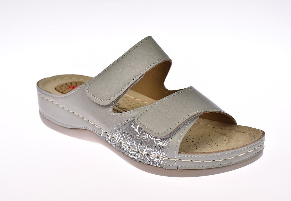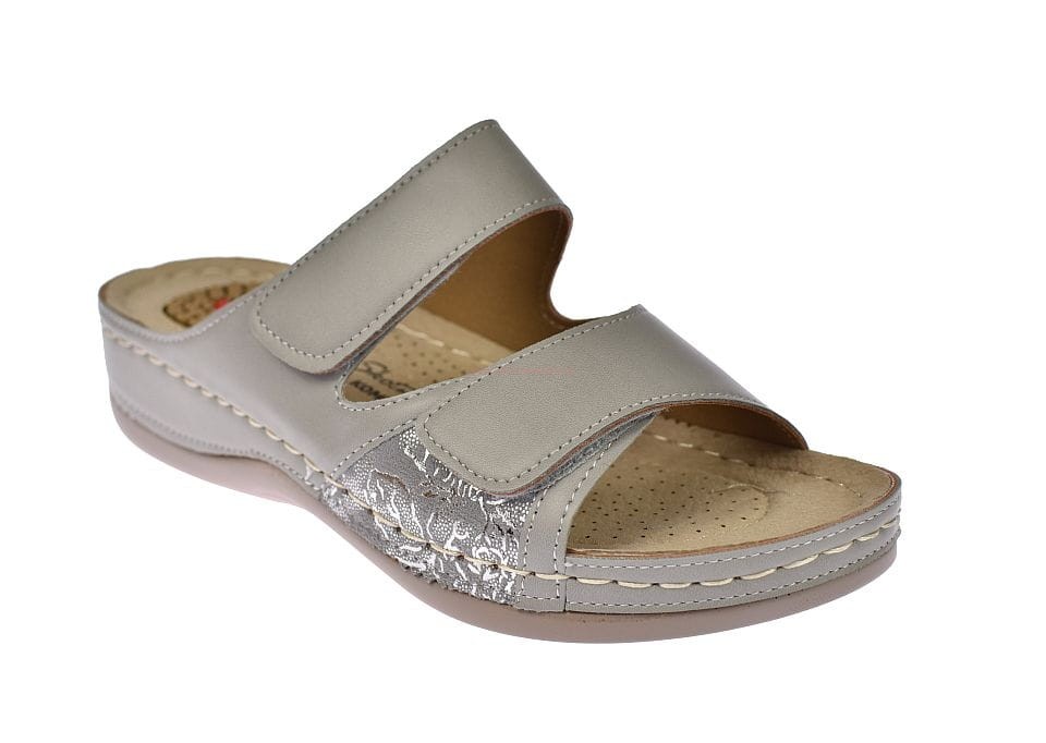 Klapki zostały wyposażone w profilowaną, skórzaną wkładkę zdrowotną, która dopasowuje się do naturalnego kształtu stopy. Specjalne wycięcie w części piętowej oraz miękka strefa amortyzująca skutecznie odciążają wrażliwe miejsca, przynosząc ulgę przy ostrogach piętowych i bólu pięt.