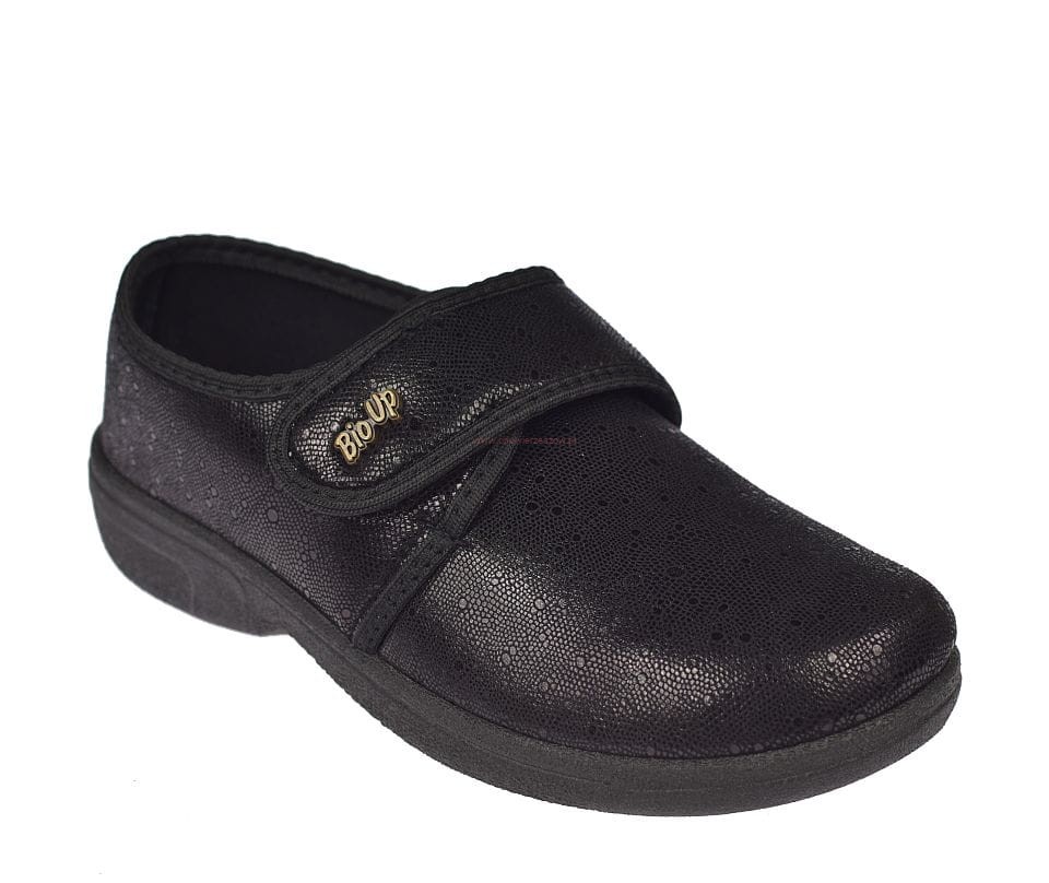 Czarne półbuty damskie BIOUP P-430 to połączenie komfortu, funkcjonalności i elegancji. Doskonałe dla wrażliwych stóp i osób z haluksami, zapewniają wygodę przez cały dzień, a rzepy i elastyczna cholewka ułatwiają idealne dopasowanie.