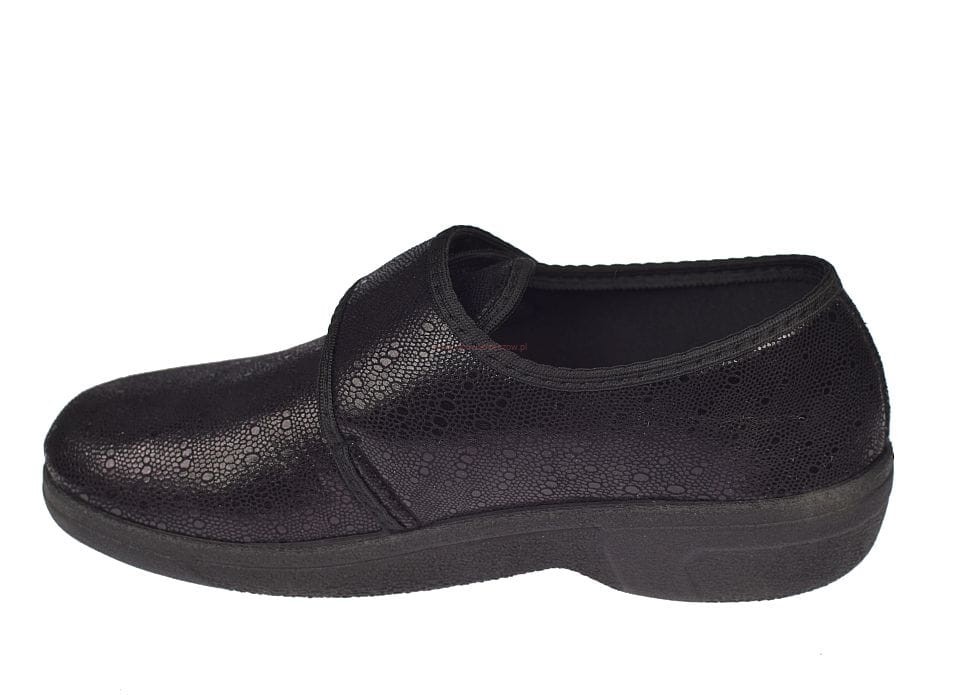 Cholewka wykonana jest z elastycznej skóry syntetycznej, która dopasowuje się do kształtu stopy, nie powodując ucisku nawet w miejscach najbardziej wrażliwych. Praktyczne zapięcie na rzepy pozwala łatwo dopasować but do stopy, a boczne gumki zwiększają komfort podczas chodzenia. Zaokrąglony przód i wysoki nosek dają swobodę palcom, co jest szczególnie ważne przy deformacjach stóp.