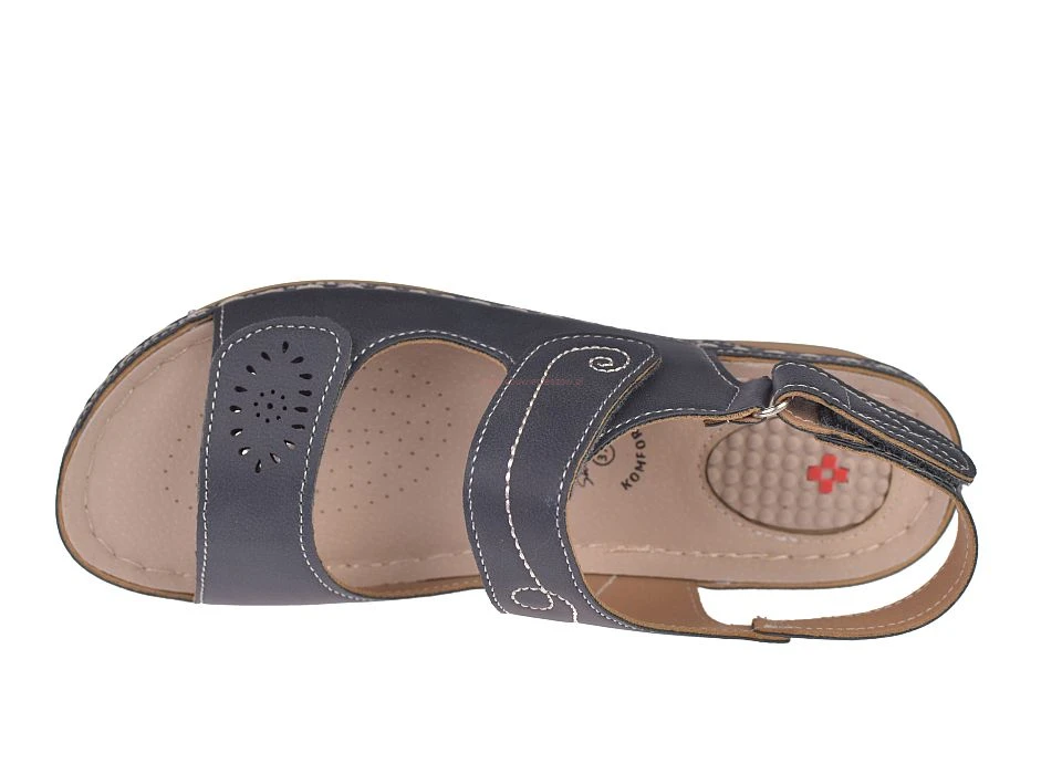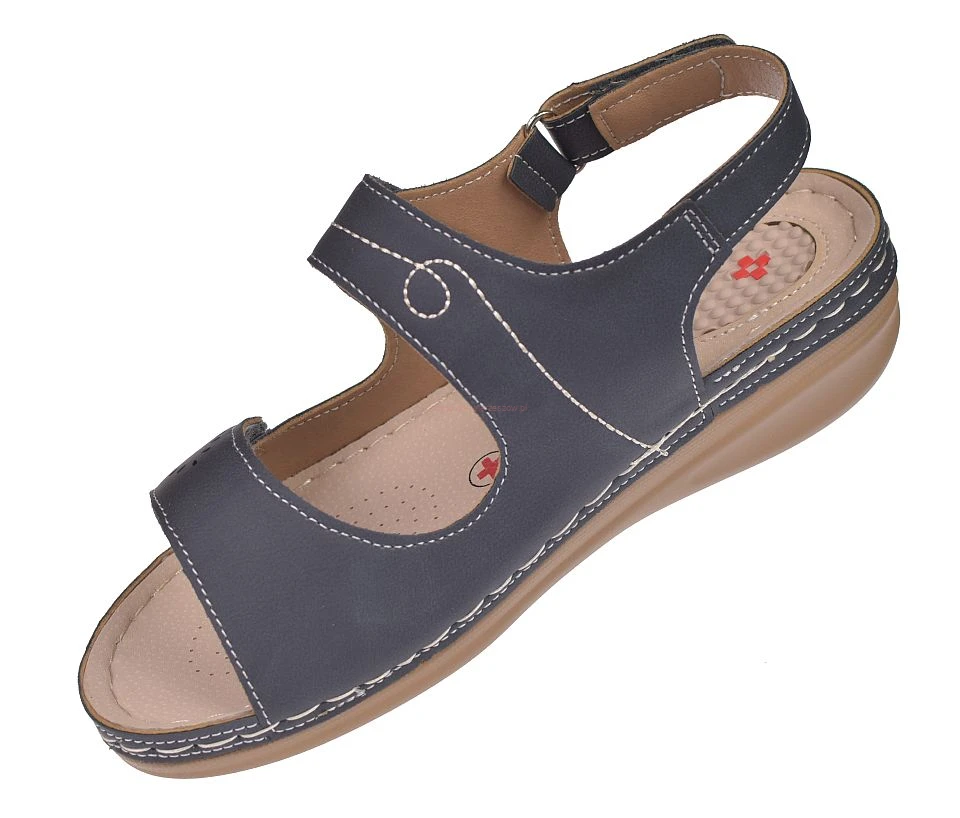 Komfortowe sandały zdrowotne Skotnicki S-3-3015 w kolorze navy, stworzone z myślą o stopach wymagających szczególnej troski. Profilowana skórzana wkładka z ochroną ostrogi piętowej zapewnia ulgę i wygodę przez cały dzień. Regulowane rzepy idealnie dopasowują się do stopy.