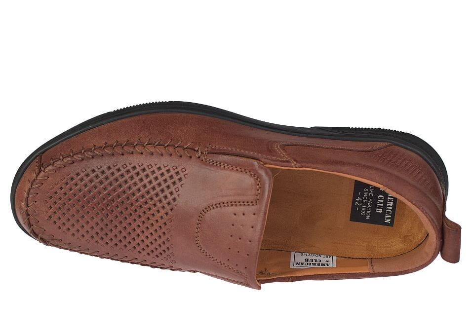 Eleganckie skórzane mokasyny męskie American Club CY140 w kolorze brązowym. Wsuwane półbuty z naturalnej skóry, z elastycznymi gumami i wygodną, amortyzującą wkładką. Idealne na co dzień i na wyjątkowe okazje.