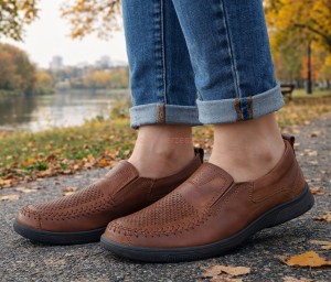 Cholewka została ozdobiona subtelną perforacją, która poprawia cyrkulację powietrza i zwiększa komfort noszenia, szczególnie w cieplejsze dni. Wsuwana konstrukcja z elastycznymi gumami po bokach umożliwia szybkie zakładanie obuwia oraz zapewnia dobre dopasowanie do stopy — także przy szerszej stopie lub wyższym podbiciu.