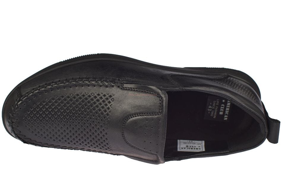 Eleganckie skórzane mokasyny męskie American Club CY140 w kolorze czarnym. Wsuwane półbuty z naturalnej skóry, z elastycznymi gumami i wygodną, amortyzującą wkładką. Idealne na co dzień i na wyjątkowe okazje