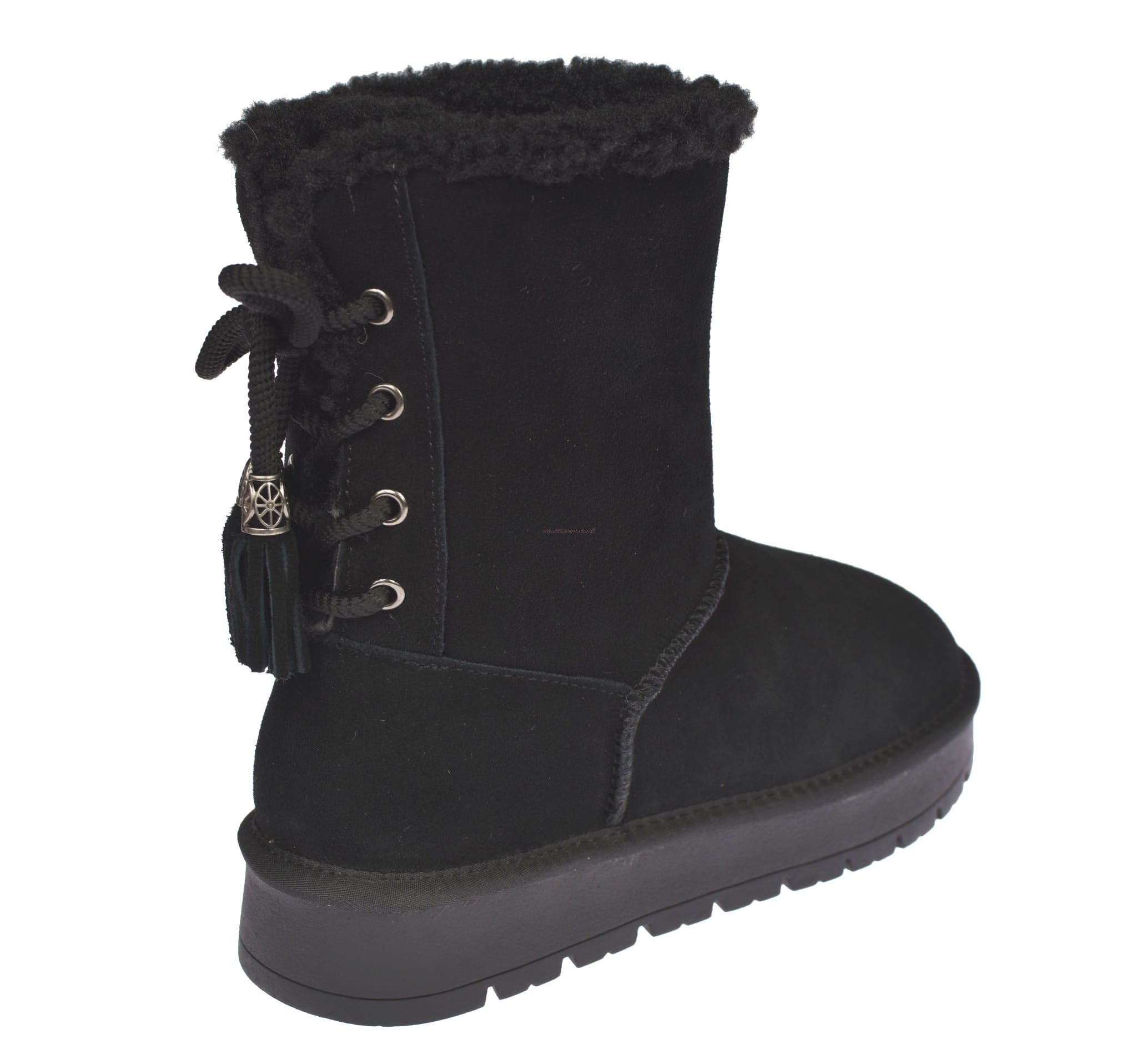 Eleganckie i ciepłe śniegowce damskie American CY180 Black z naturalnej skóry welurowej. Wysoka cholewka do połowy łydki, sznurowane od tylnej części cholewki, ocieplane futerkiem – idealne na zimowe spacery i codzienne wyjścia.